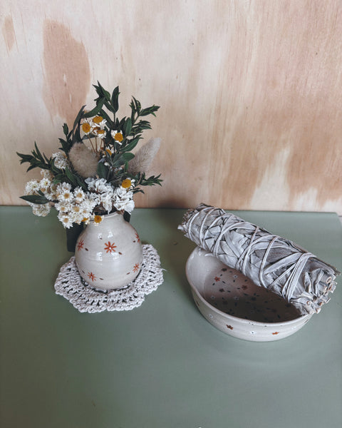 Each piece is thoughtfully chosen: a hand-crafted ceramic vase filled with everlasting wild blooms, a matching speckled bowl for resting your sage or treasures, a white sage bundle for cleansing and renewal, and a handmade crochet doily to soften and anchor it all.